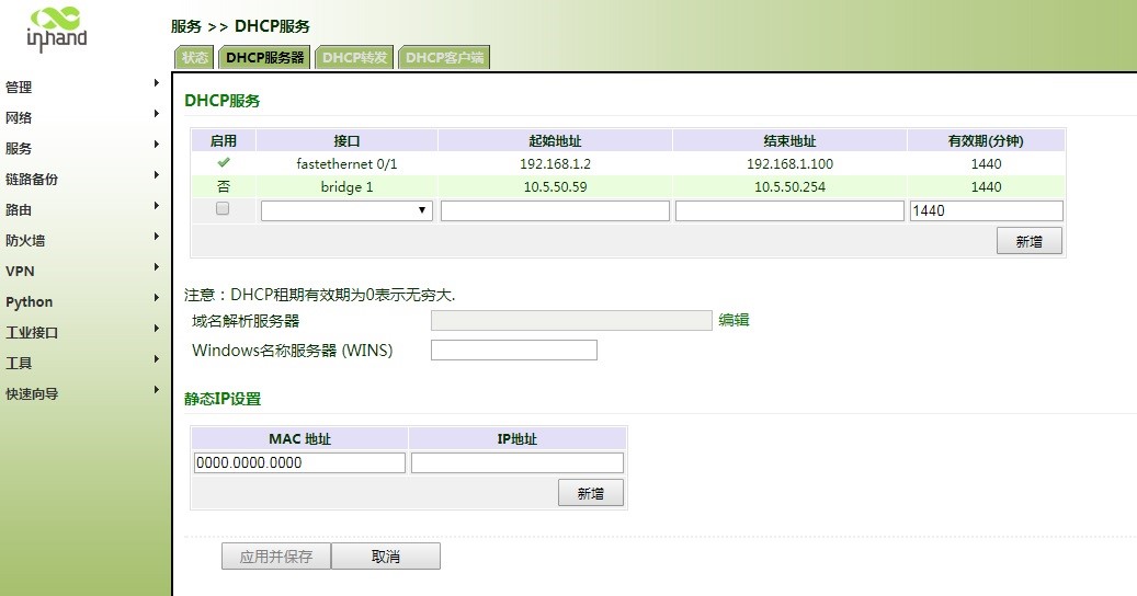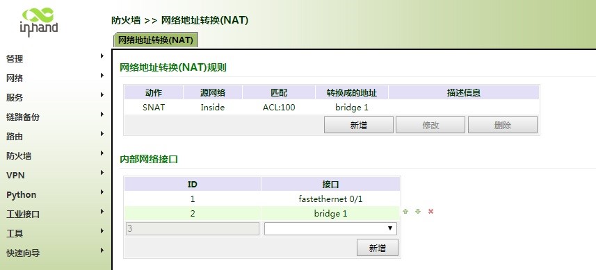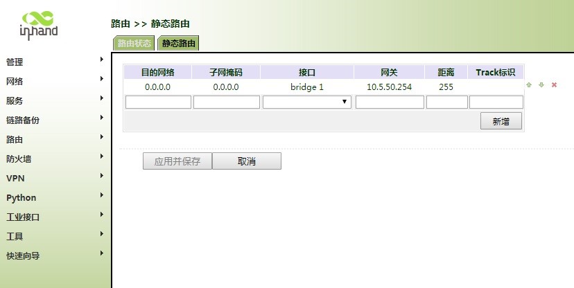 6.如果要IR900连接无线AP后能正常上网,还需要修改静态路由配置和防火墙NAT配置,路由配置选择桥接口,并将无线AP的网关地址加上,如下图: