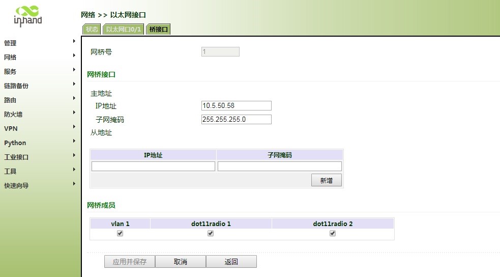 4.然后,进入“网络”→“以太网接口”→“桥接口”,修改桥接口配置,手动填写AP端给IR900分配的ip地址,并将网桥成员dot11radio 2打勾,如下图: