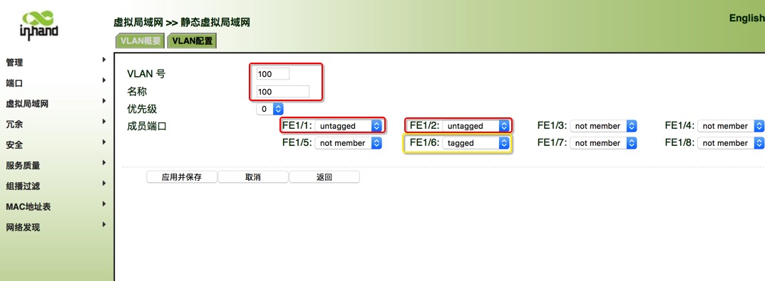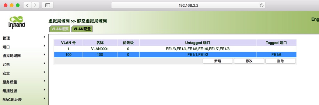 ISM交换机如何添加VLAN? Admin 这家伙很懒,还没有设置简介 1 人点赞了该文章 · 4156 浏览 如下图 路由器连接 第一台SIM F1/1 接口 untagged VLAN 100 (access 模式 ), 两台ISM使用 F1/6 设置为 tagged VLAN 100 (trunk模式)在两台交换机额直接,PC连接F1/1 VLAN100 。 两台交换机设置是一样的,登录交换机192.168.2.2 用户名 adm 密码 123456 虚拟局域网 新增VLAN 100