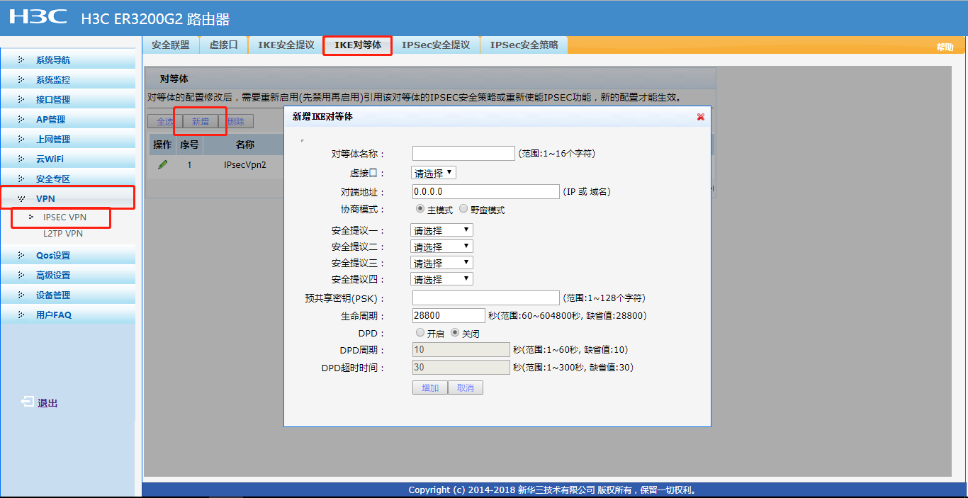 4、IKE对等体 =》 新增 =》 对等体名称按需填写 =》 虚接口选择步骤2配置的虚接口 =》 对端地址Server端可写0.0.0.0 =》 野蛮模式 =》安全提议一选择步骤3配置的提议 =》 预共享密钥与R900密钥相同abc123 =》生命周期等默认即可