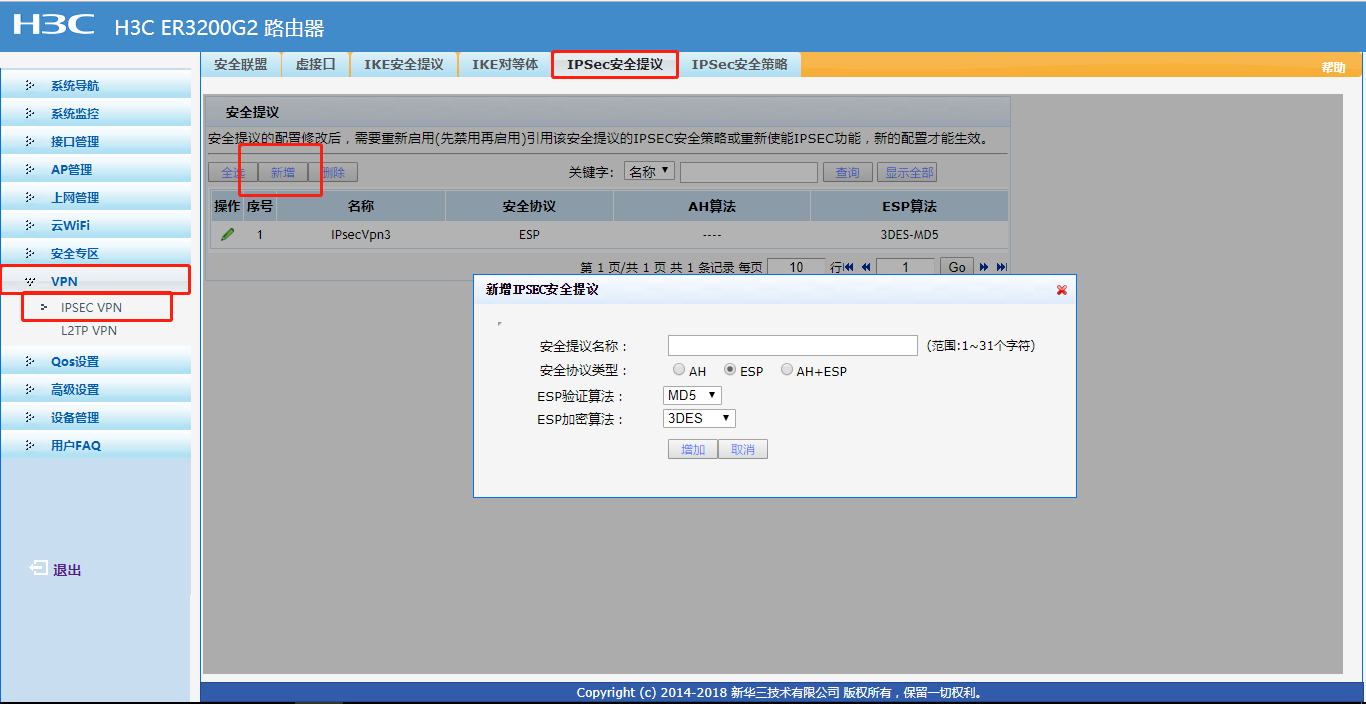 5、IPSec安全提议 =》 新增 =》 安全提议名称按需填写 =》安全协议类型、算法按需填写即可