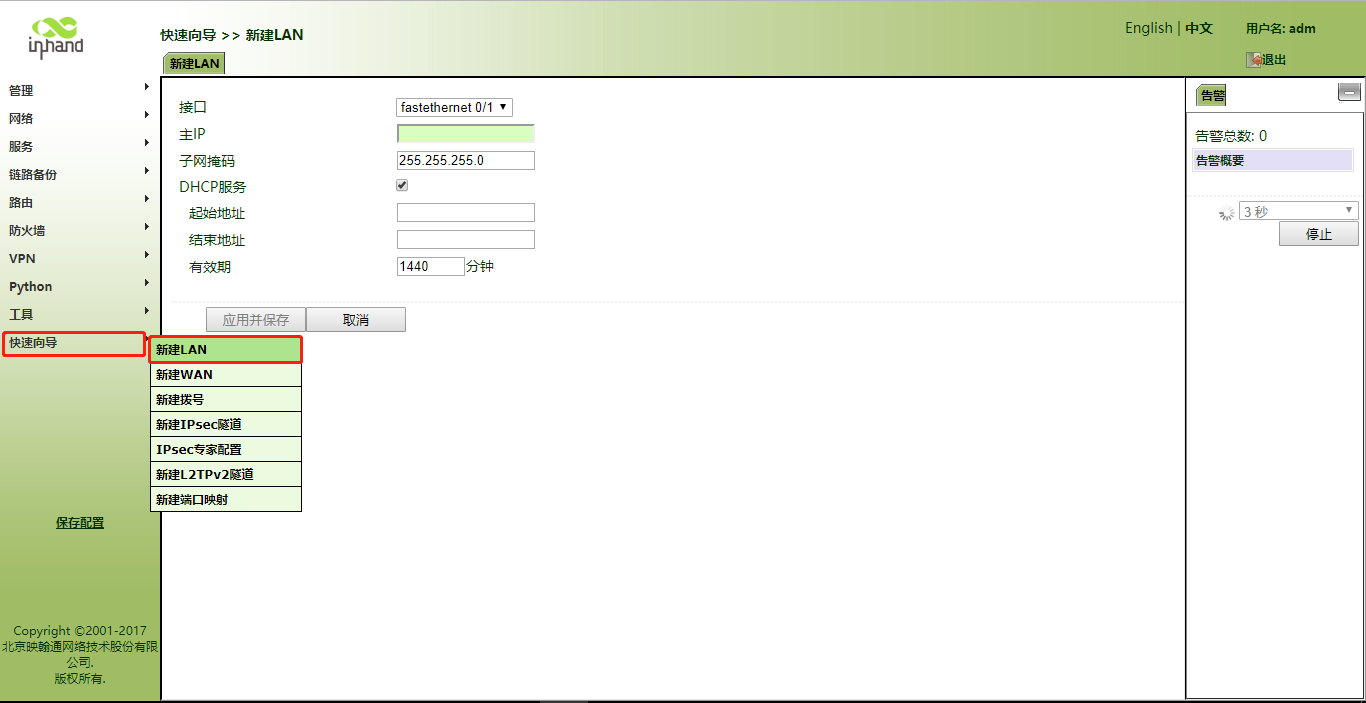 Web方式登录IR900路由器,默认IP:192.168.2.1点击“快速向导” =》 “新建LAN”菜单,如下图: