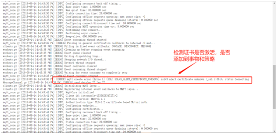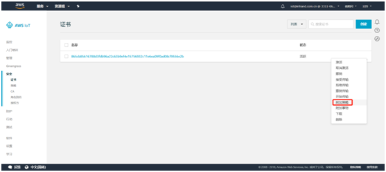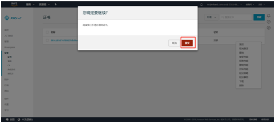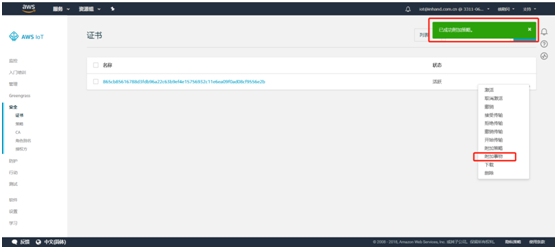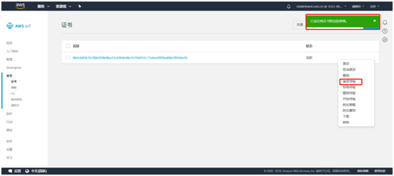 创建完成后提示事物和证书创建成功。需要下载事物的证书和私有秘钥并激活证书,之后点击完成。