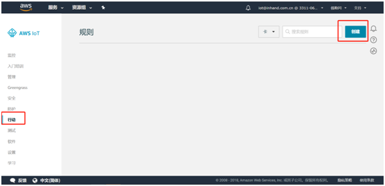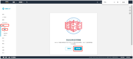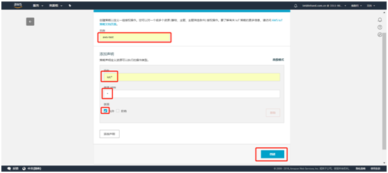 输入策略名称。操作默认填入iot:*;资源ARN填入*(这样所有客户端都能连接至AWSIoT);效果选择允许。随后点击创建则策略创建成功。