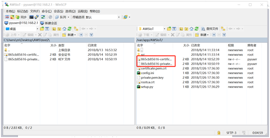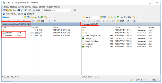 之后在WinSCP左侧页面进入到从AWS下载的证书和私钥文件夹下;右侧页面进入到/var/app/AWSIoT文件夹下。将下载好的证书和私钥导入至当前文件夹
