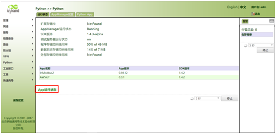 第二步:点击“Python>>运行状态”,可在“运行状态”界面查看python相关信息及SDK版本,“运行状态”如图所示。