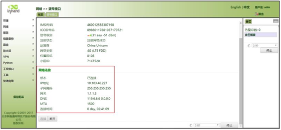 2. 待网络连接状态显示为已连接并且显示已分配相应IP地址等状态时说明SIM卡已成功上网,如图所示。