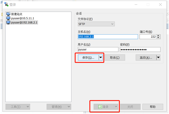 运行WinSCP软件,按下图配置连接:文件协议选择SFTP;主机名为网关ip地址;端口号222;用户名pyuser;密码为网关序列号(可在管理--系统页面直接复制)。配置完毕后点击保存并登录