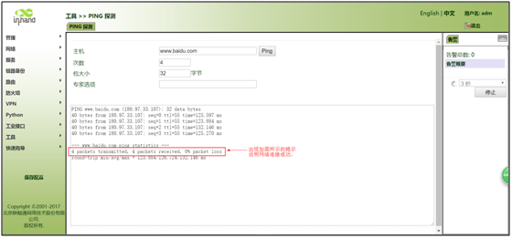 在“主机”中填入国内常用网址来进行测试,出现下图所示说明表明网关已经成功接入互联网。