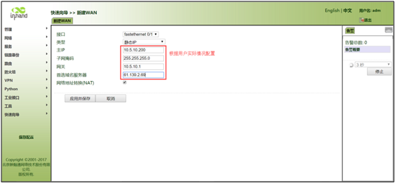 选择1)静态IP配置:选择接口“fastethernet 0/1”,类型选择“静态IP”,配置相应网络参数,勾选NAT功能并点击<应用并保存>,如图所示。