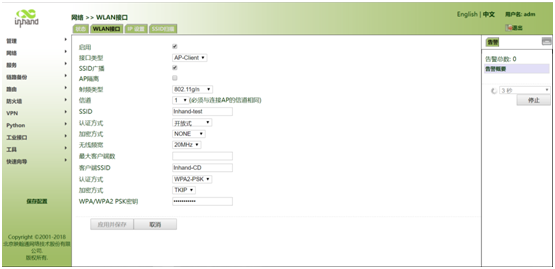 进入“网络>>WLAN接口”页面,如图,启用WLAN接口并配置参数,下表是部分参数配置说明