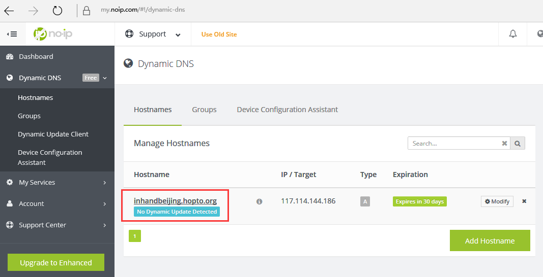 查看域名解析是否成功。下面为成功时的日志、访问效果、NoIP 账号下的域名关联的IP是否已经更新。