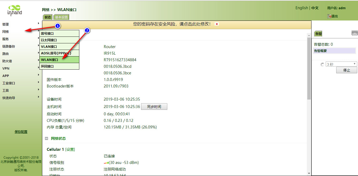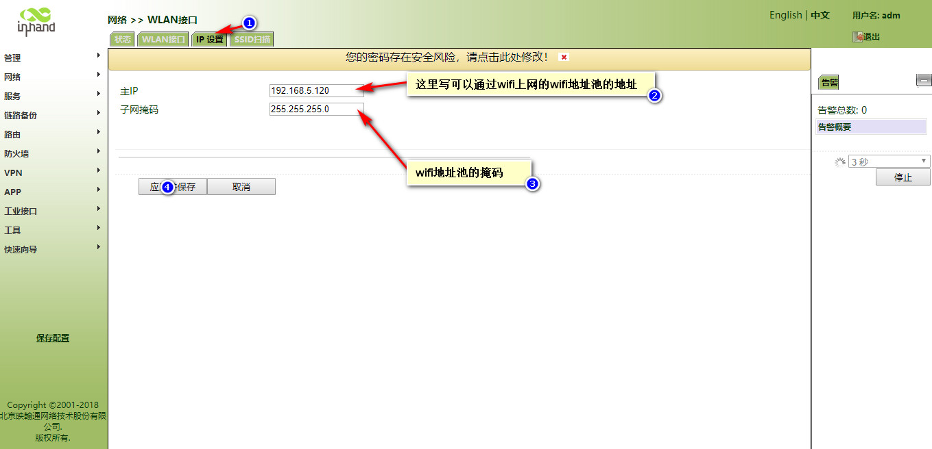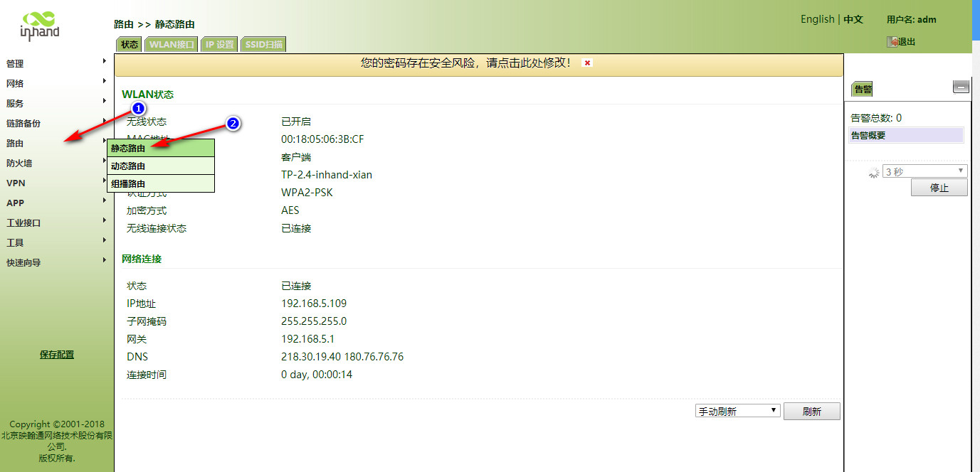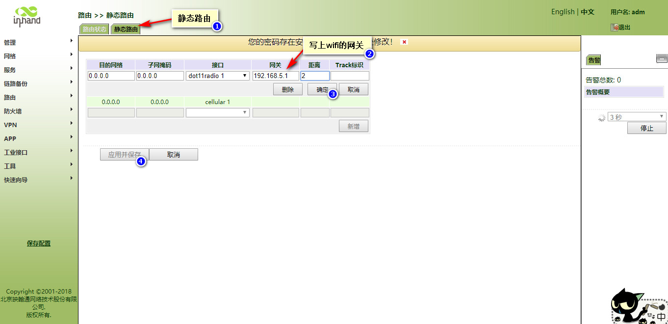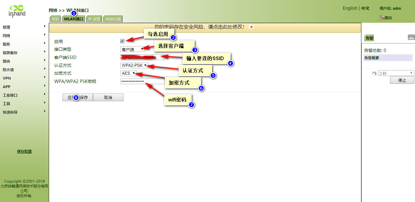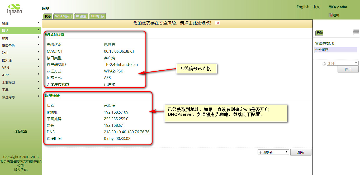 怎样使用IR900连接WiFi上网呢?? 奇兵 这家伙很懒,还没有设置简介 1 人点赞了该文章 · 3175 浏览 1、登录网关。 2、开启网关的DHCP客户端(默认开启)。 3、开启WLAN客户端功能。 4、填写要连接的WIFI信息。 5、查看连接情况 6、写静态路由。 7、设置防火墙 8、WiFi的DHCPserver没有开启的话继续向下执行,如果上边的已经测试可以通,则不需要执行下边的操作。