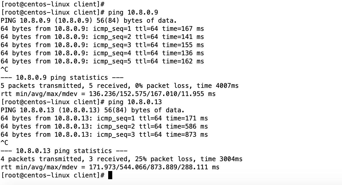 [root@centos-linux client]# route Kernel IP routing table Destination Gateway Genmask Flags Metric Ref Use Iface default gateway 0.0.0.0 UG 100 0 0 eth0 10.1.1.0 0.0.0.0 255.255.255.0 U 100 0 0 eth0 10.8.0.0 0.0.0.0 255.255.254.0 U 0 0 0 tun1 10.8.0.0 10.8.0.1 255.255.0.0 UG 0 0 0 tun1 [root@centos-linux client]#Centos ping 下图路由器IP地址:
