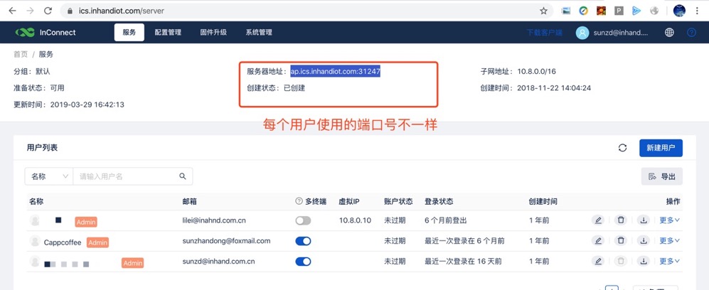 2. 路由器InConnct 建立端口 54.222.145.115 UDP协议端口需要登陆用户在平台的账号内查看,如下图用户所使用的端口为DUP 31247