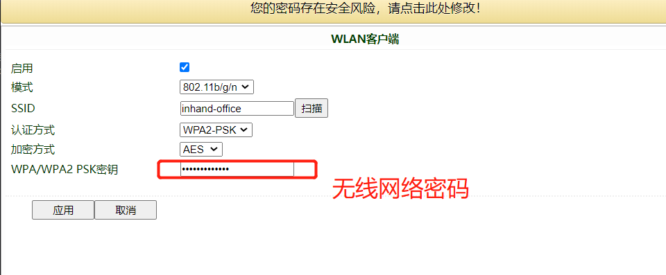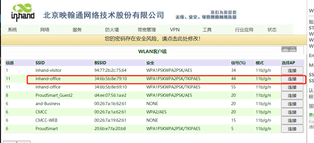 选择你需要连接的无线网络,这里以inhand-office为例,点击连接