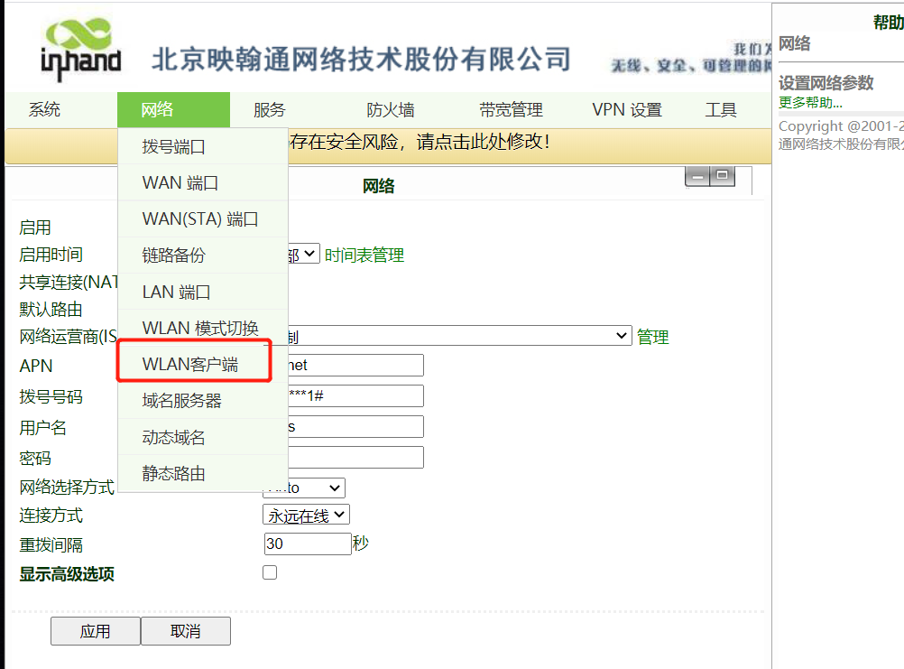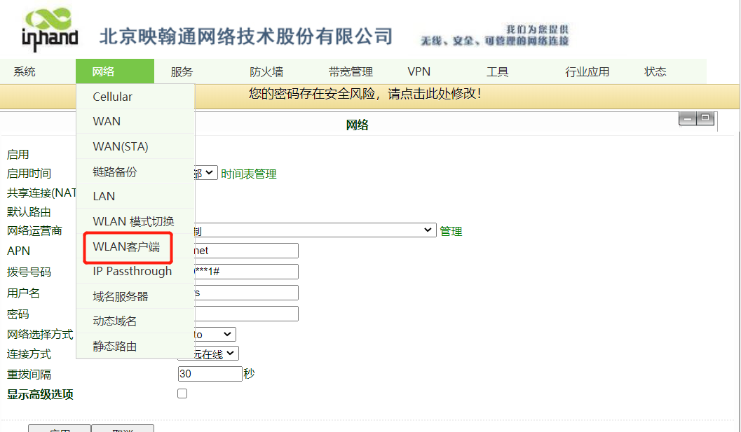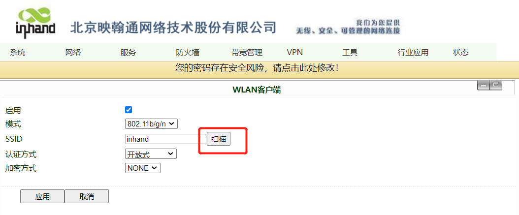 5)配置WLAN客户端,选择网络》wlan客户端,选择启用后,点击扫描按钮。