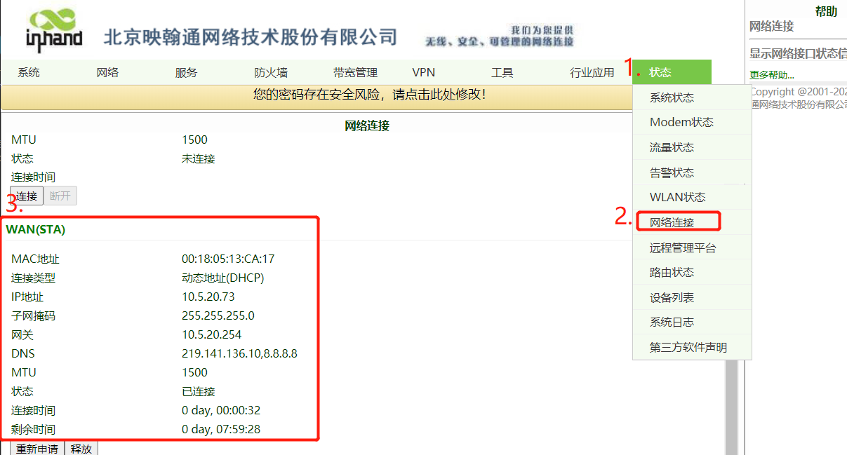 选择状态》网络连接,查看WAN(sta)获取到的地址情况。
