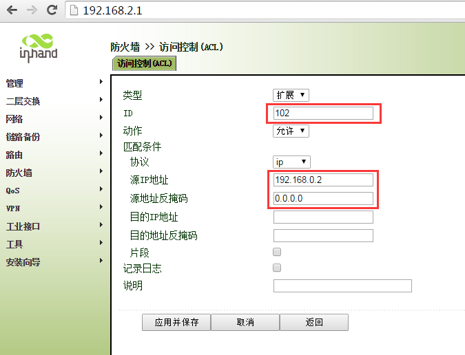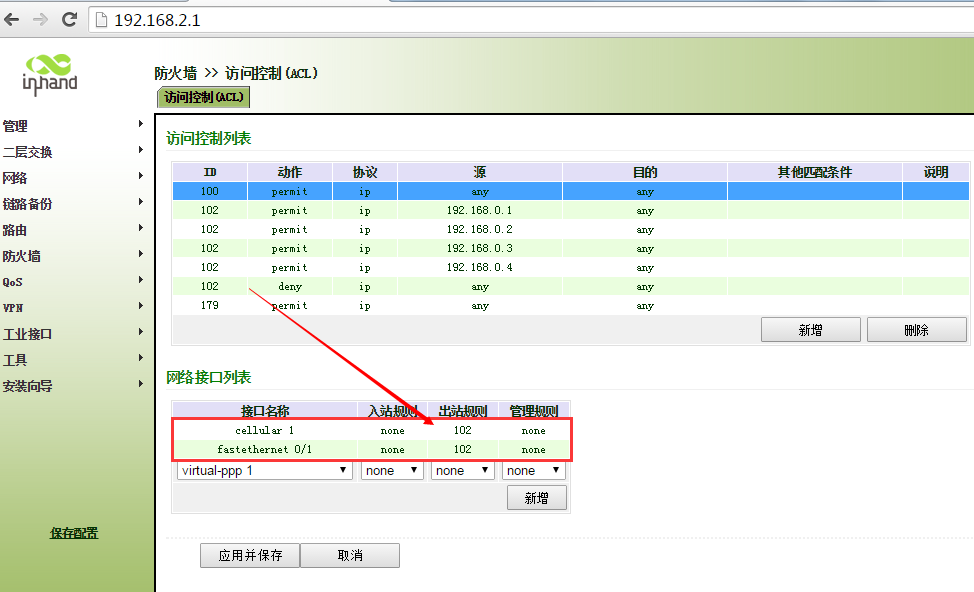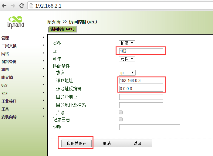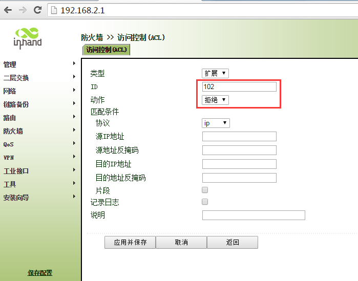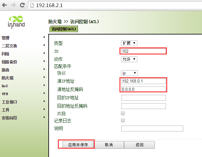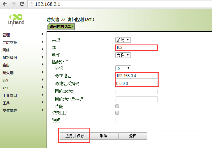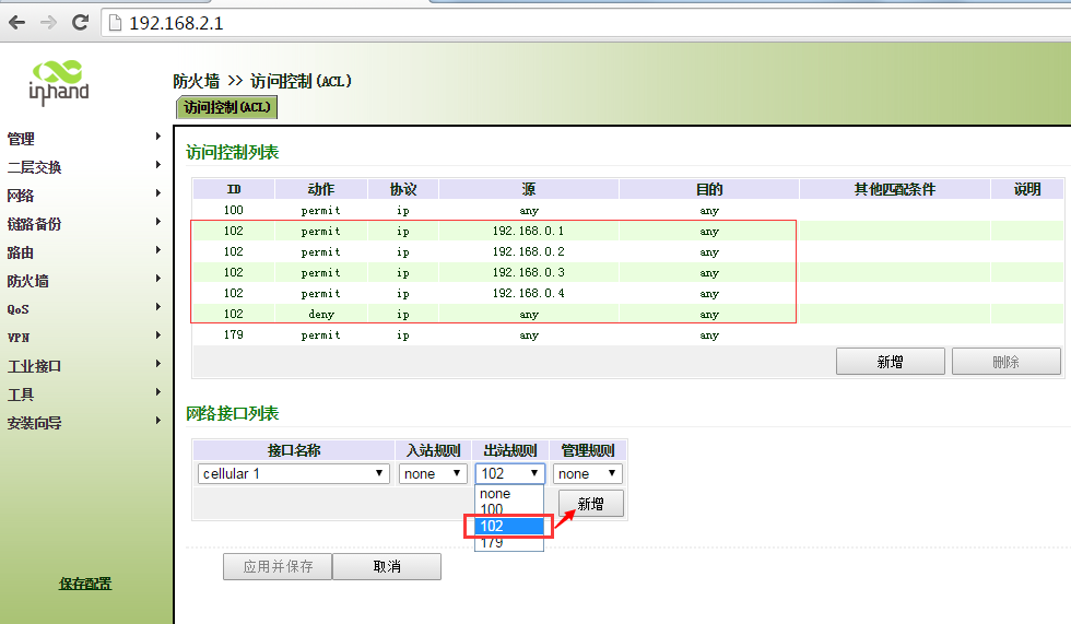ir900-acl应用只允许部分ip地址访问外网 Sunzd 这家伙很懒,还没有设置简介 0 人点赞了该文章 · 3693 浏览 新建ACL 102 匹配192.168.0.1数据 继续新增ALC 新建ACL 102 匹配192.168.0.2数据 新建ACL 102 匹配192.168.0.3数据 新建ACL 102 匹配192.168.0.4数据 新建ACL 102 拒绝其他任何数据 将ACL 102 加入到WAN端口“出站规则”中 ,点击应用保存即可。 注意新建ACL102 “拒绝”的ACL是最后添加,不能在添加其他IP地址前添加。
