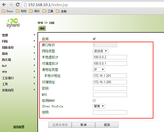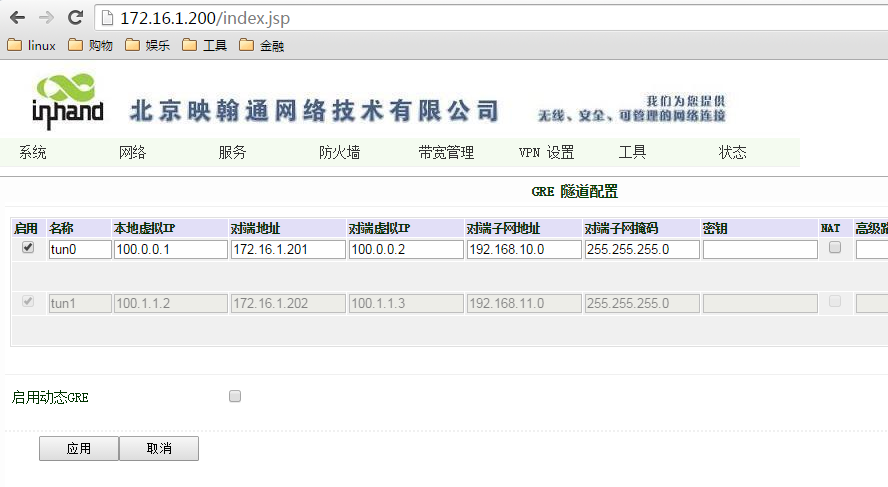 IR900-GRE配置 Sunzd 这家伙很懒,还没有设置简介 0 人点赞了该文章 · 2790 浏览 GRE隧道技术(Tunneling)是一种通过使用互联网络的基础设施在网络之间传递数据的方式。使用隧道传递的数据(或负载)可以是不同协议的数据帧或包。隧道协议将其它协议的数据帧或包重新封装然后通过隧道发送。新的帧头提供路由信息,以便通过互联网传递被封装的负载数据。 IR700GRE配置 IR900 配置 1、修改LAN地址 2、新增GRE 3、添加去往对端路由器LAN网段路由 测试联通性