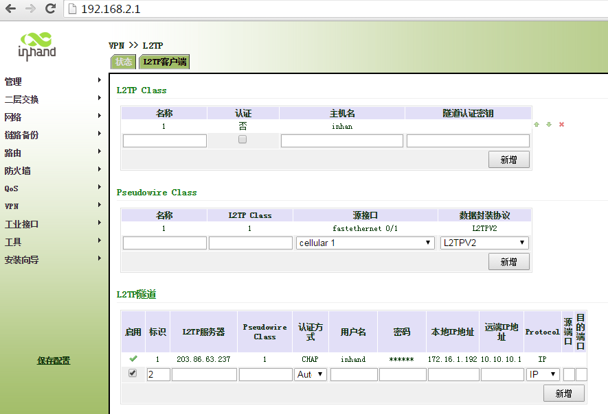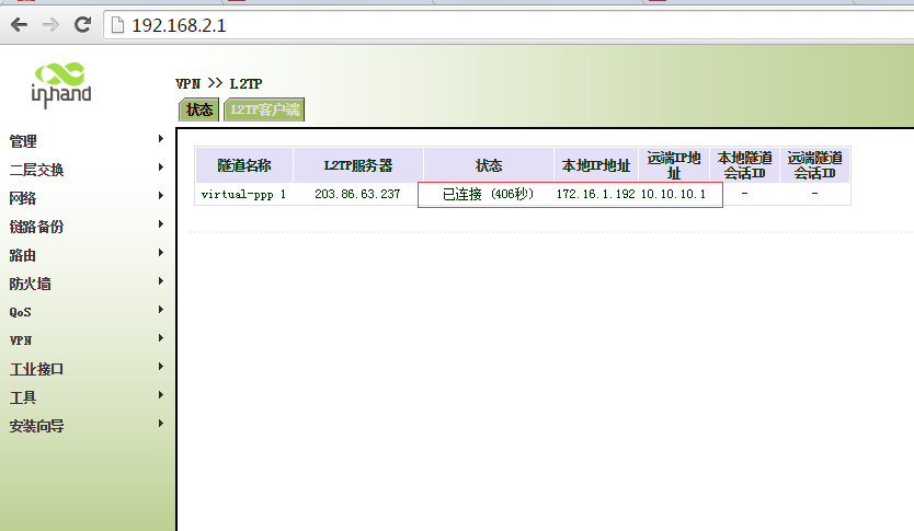 3、L2TP隧道配置中,填写LNS服务器地址,调用Pseudowrie Class1,认证方式为CHAP,用户名密码填入、本地IP 172.16.1.192(Cisco IP l2tp pool中的地址),远端IP 10.10.10.1(Cisco interface virtu1-template2 的IP)。建立成功后如图3-2。