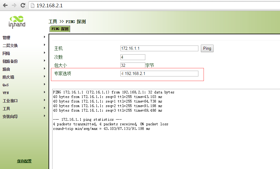 专家选项中“-I 192.168.2.1”表示是以为源IP地址 192.168.2.1 ping 目的IP地址 172.16.1.1。