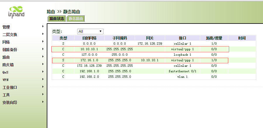路由状态中是路由器的实时路由状态,若L2TP没有建立成功, 两条接口为virtual-ppp1的路由条目都不会存在于路由状态页面。