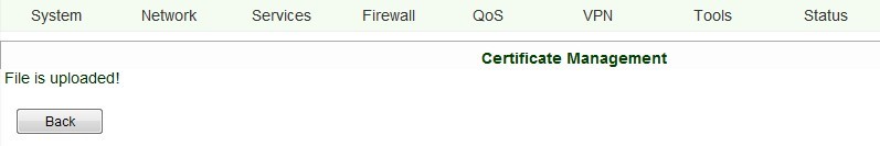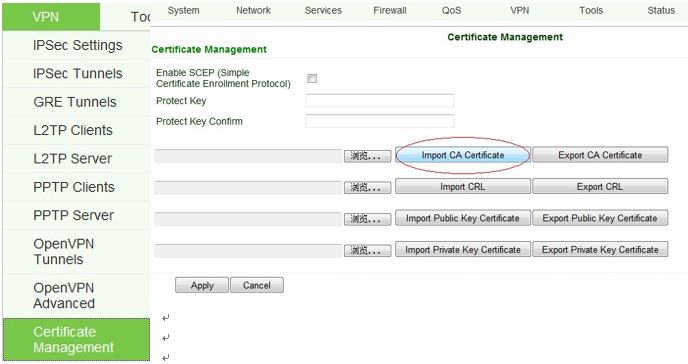 Click the “Browse” button at the left side of “Import CA Certificate” and then choose the right “root certificate” (e.g.: ca. crt), then click “Import CA Certificate” button, and you will see: