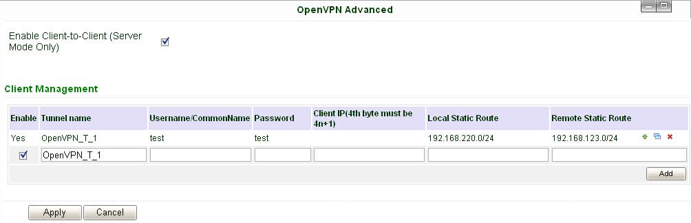 Enable Client-to-Client (Server Mode Only), and click “Add” to add this tunnel setting:
