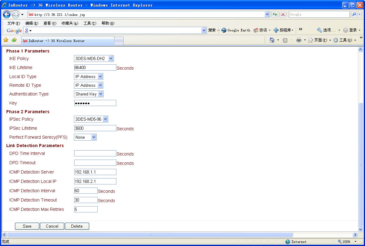 IKE策略:可以选择3DES-MD5-96或AES-MD5-96。建议选择3DES-MD5-96。