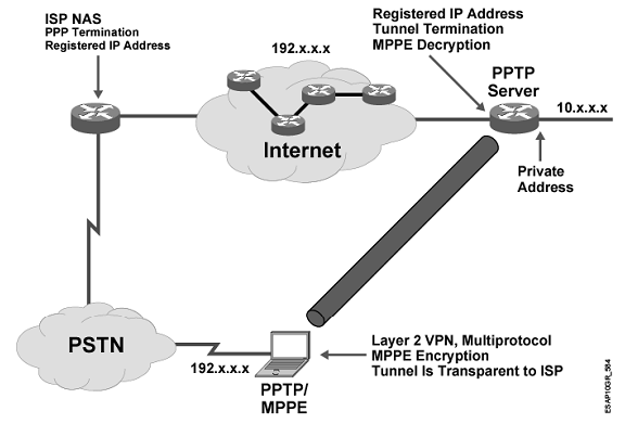 4. 使用MPPE加密PPP数据包,这些数据包接下来通过enhanced GRE封装,并在IP网络上传输