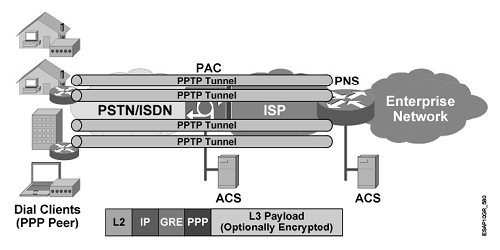 • PPTP Access Concentrator (PAC): 接入服务商,允许拨号接入连接(通常是由ISP担任,而且不需要ISP的协助来建立隧道)