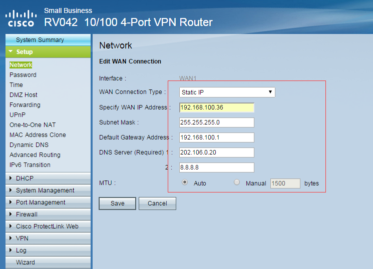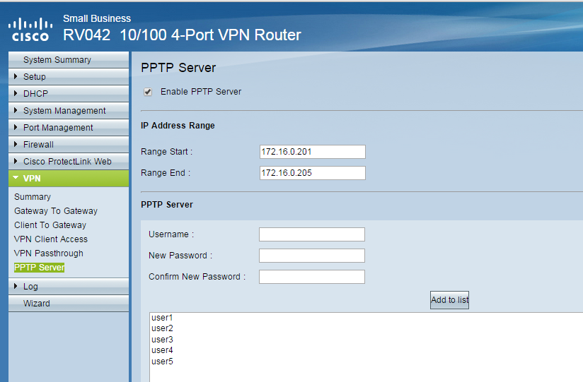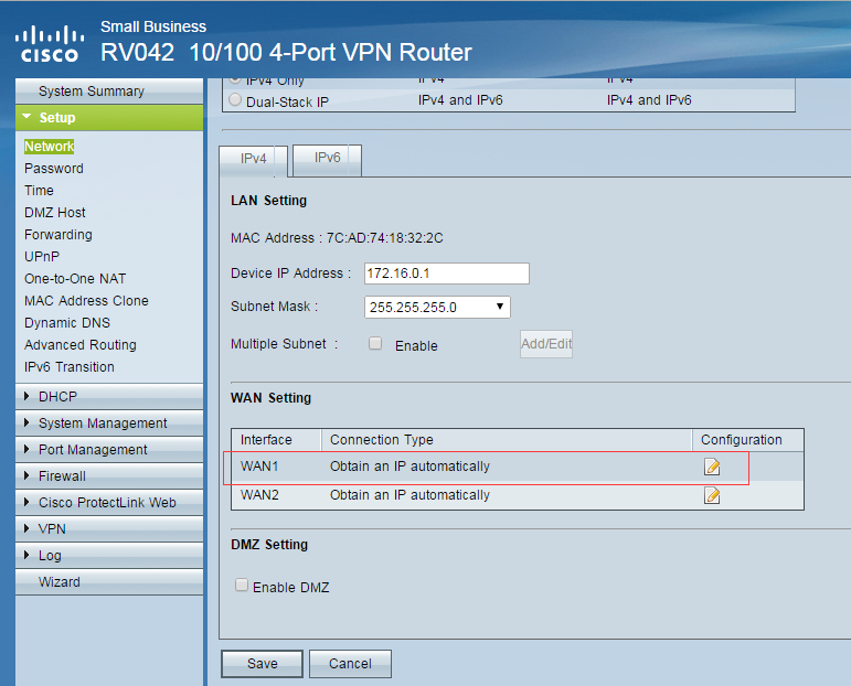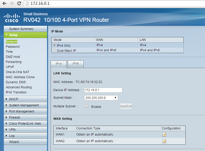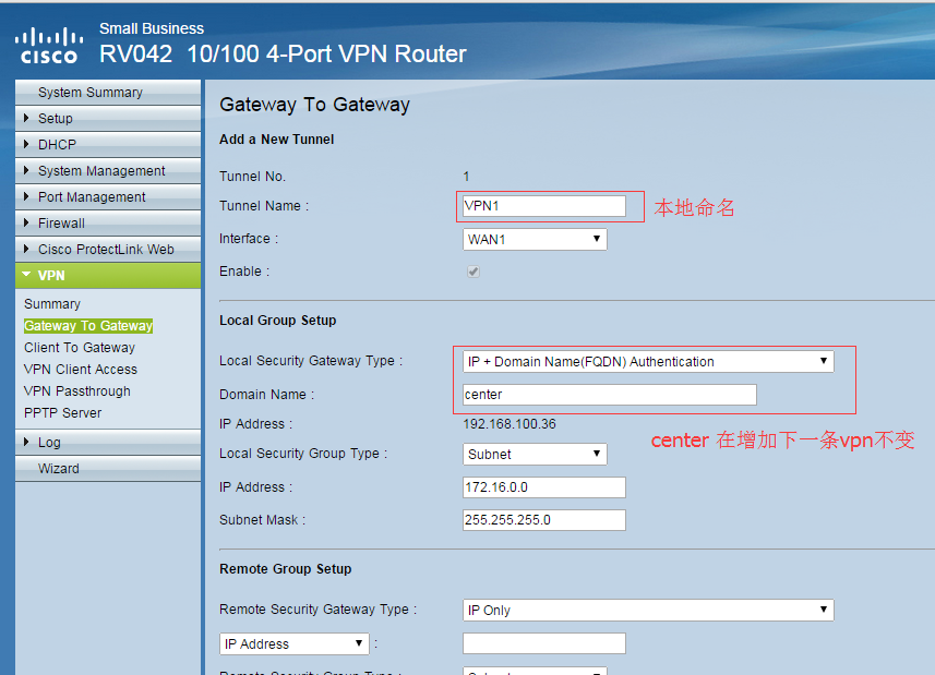 3、 CiscoRV042 为VPN 路由器 ,WAN (Internet)接口为 192.168.100.36,LAN接口为172.16.0.0/24