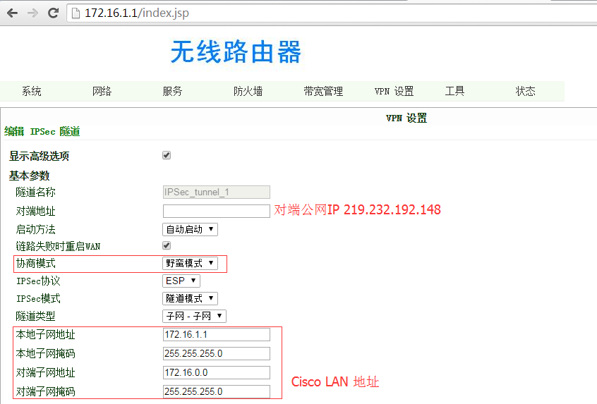 说明 : 在该拓扑中防火墙将公网IP 219.232.192.xxx 映射为内IP 192.168.100.36,在通常情况若无防火墙则可以将公网IP直接配置到CiscoRV042 的WAN端口即可。CiscoRV042是一款低端VPN路由器,若需要性能更强的可以根据具体情况咨询。