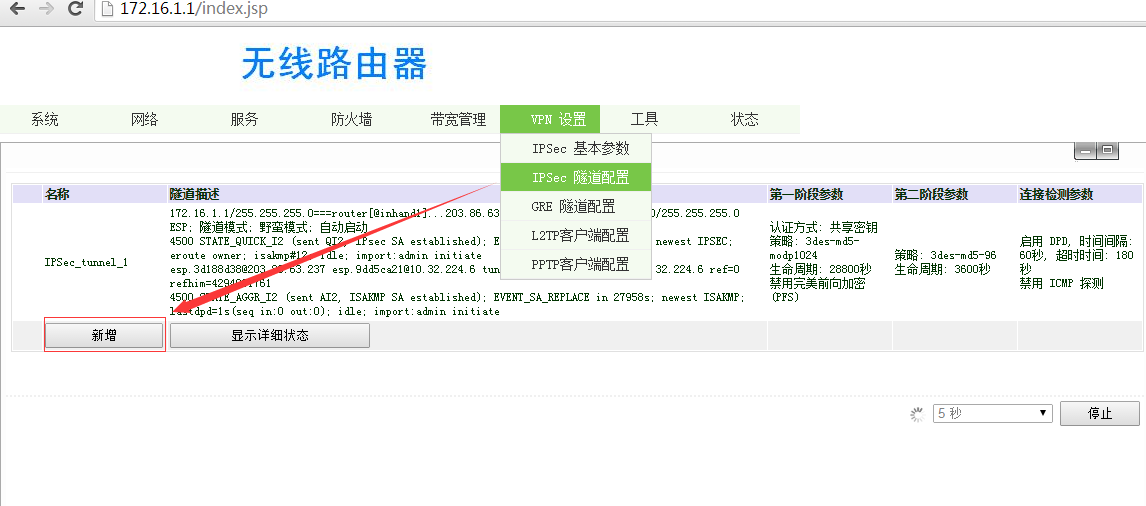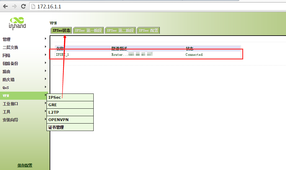 VPN建立后,IPSec状态选项卡中的隧道“IPSEC_1”的状态为Conneted。