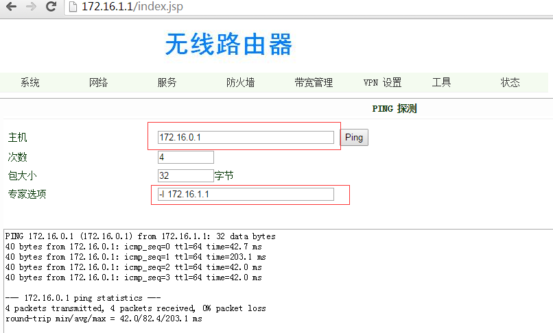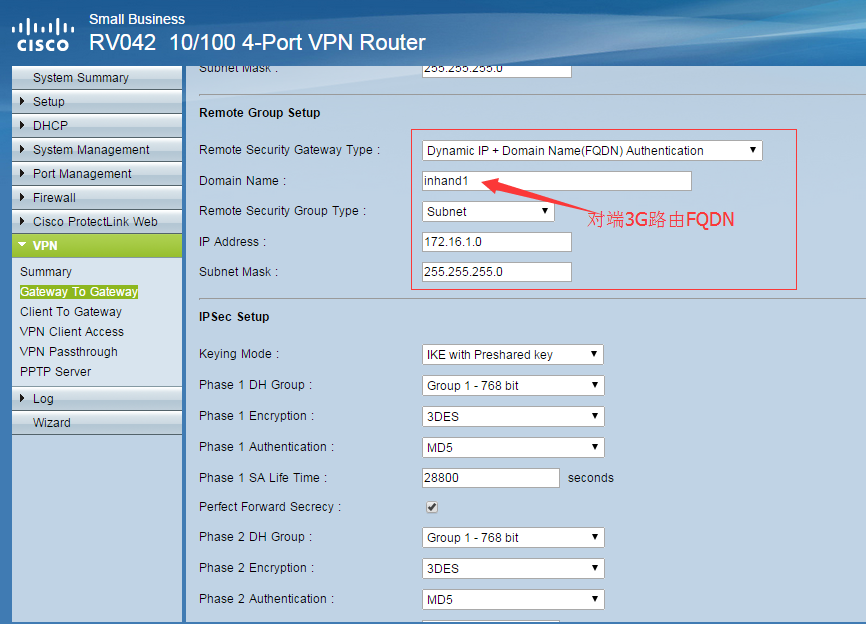 5、 CiscoRV042 与3G 路由器之间建立IPSecVPN 后,RV042 LAN网段172.16.0.0/24 就可以与3G路由器 LAN 网段 172.16.1.0/24 相互访问。