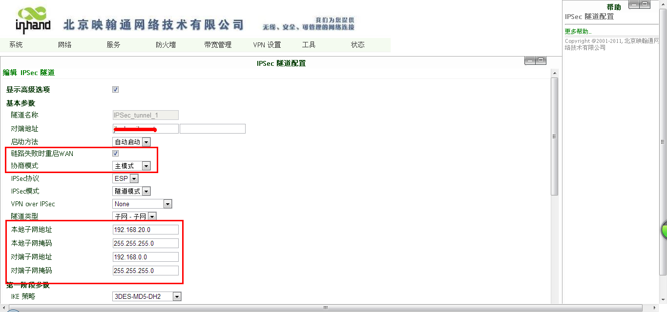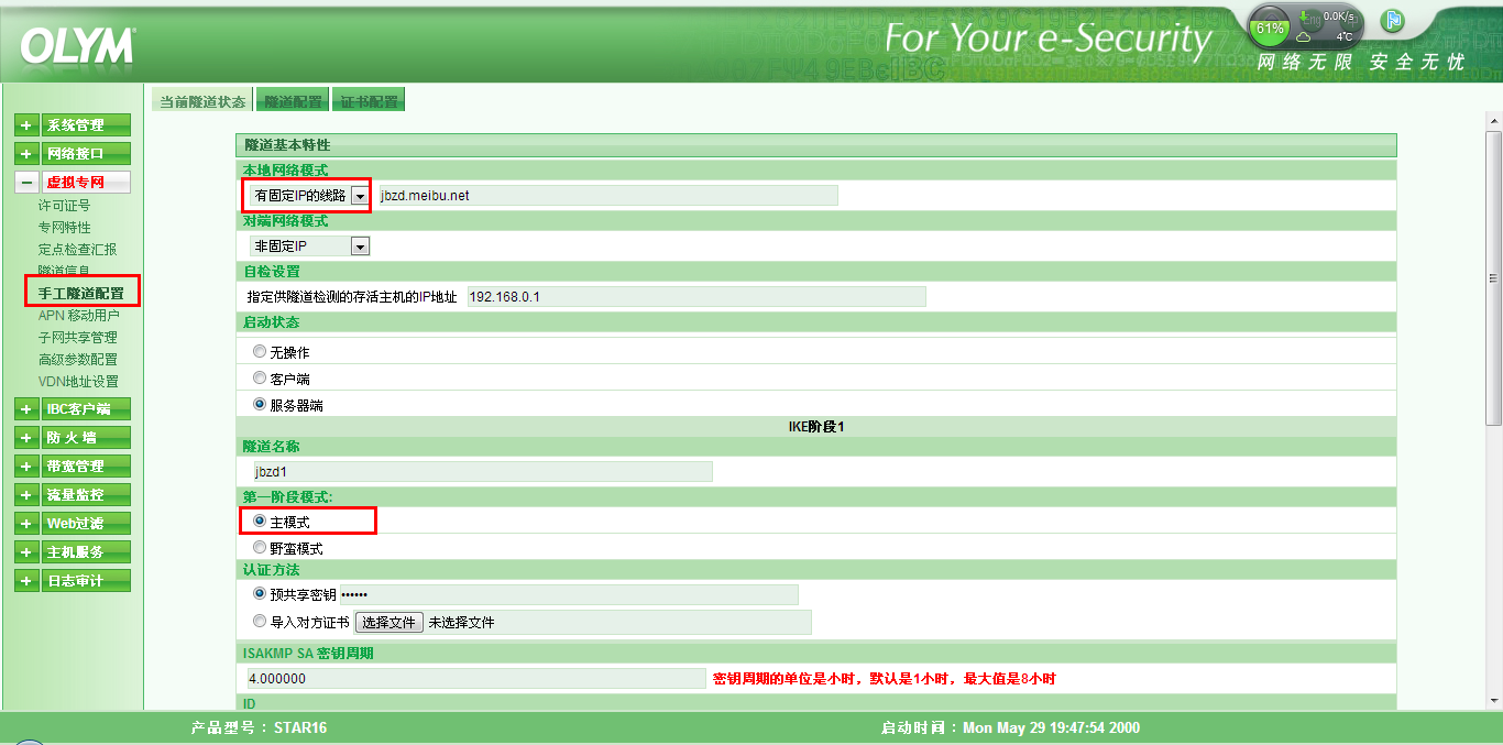 (该设备生产厂给的文档提出的要求是:如果对端使用动态IP地址则要使用野蛮模式,起初按照野蛮模式+ User FQDN配置,该防火墙日志提示“无法验证对端ID”)