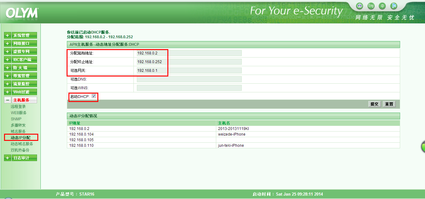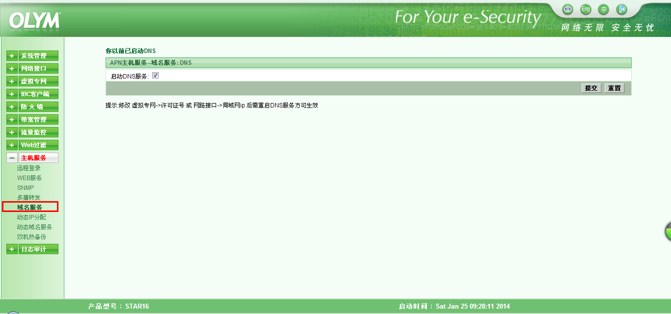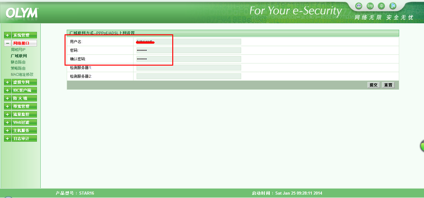 (该配置为ADSL有线网络,可获得动态公务IP,为便于3G路由器可以连接至该防火墙,所以在该防火墙上配置了DDNS服务,在此处填写“域名”即可。)