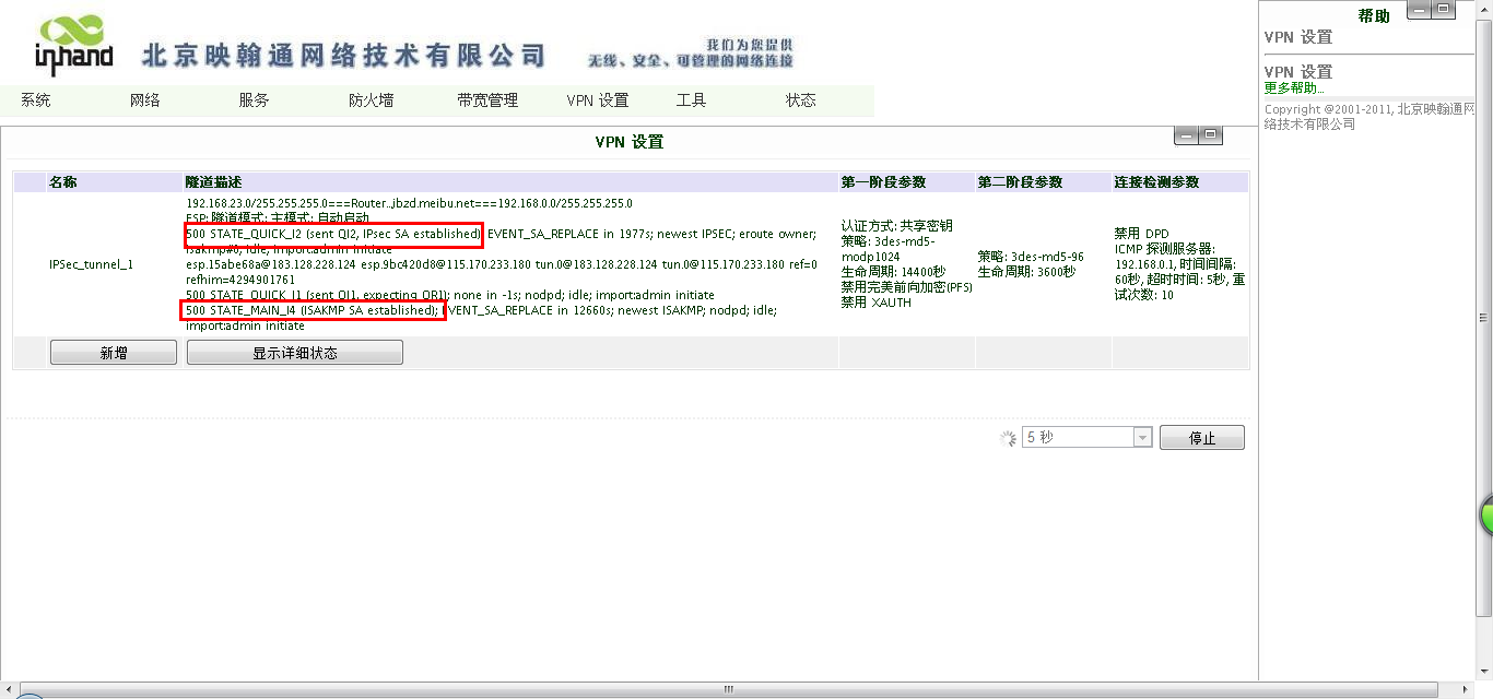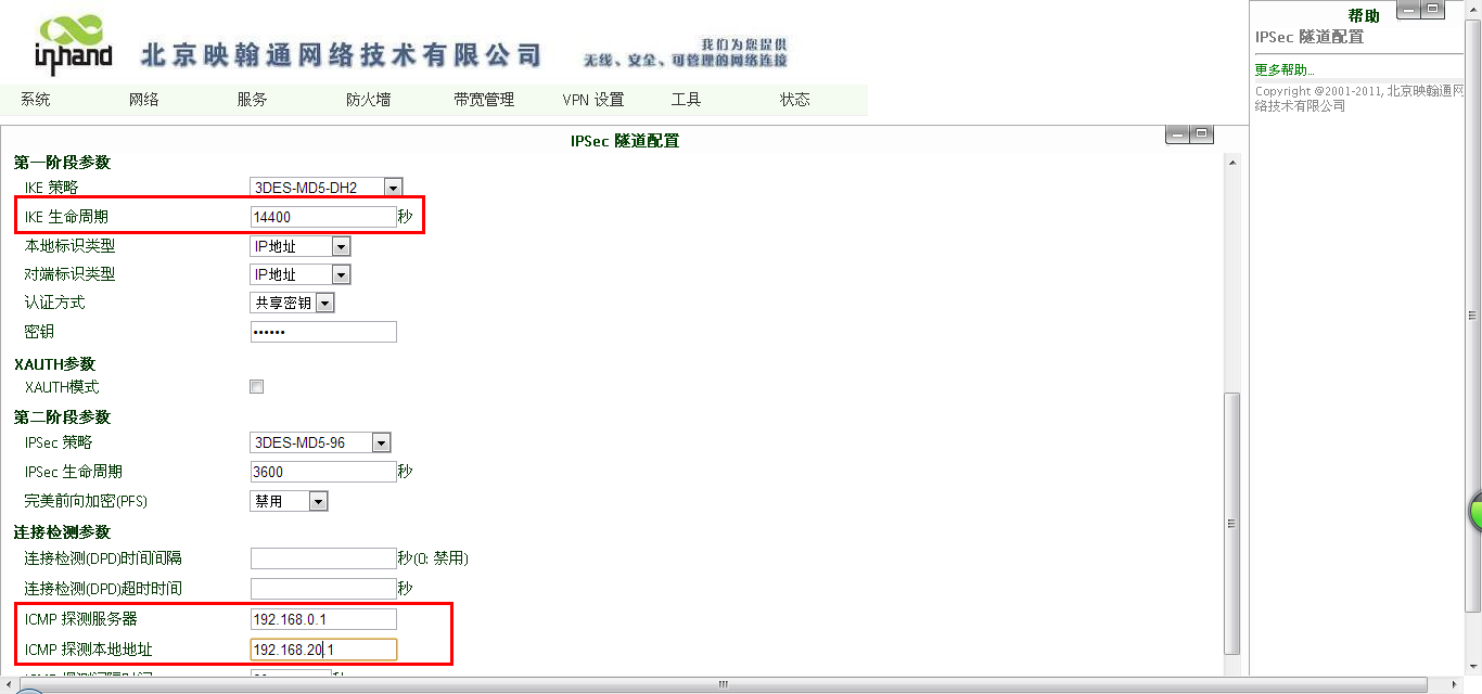 IKE生命周期:14400秒(为对应防火墙ISSKMP SA 密钥周期:4小时)