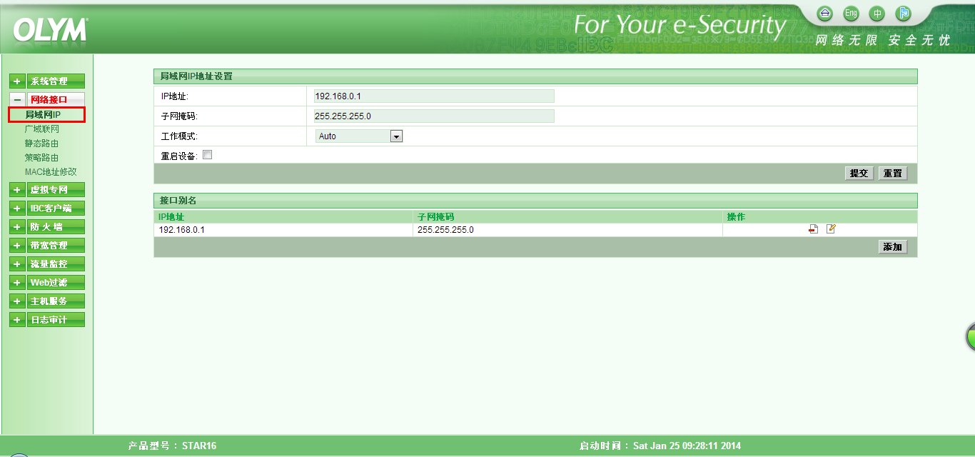 自检测设置:192.168.0.1 (LAN接口IP地址)