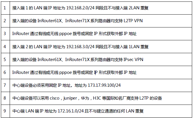 只需增加一条静态路由,到新增远端InRouter内部网络的下一跳为在配置新增远端InRouter L2TP VPN时填写的”本地IP地址”,其他无需更改。 CiscoRouter(config)#ip route 192.168.3.0 255.255.255.0 10.255.255.2 //192.168.3.0 255.255.255.0为新增远端InRouter的内部网络,10.255.255.2为在配置远端InRouter的L2TP时填写的“本地IP地址”