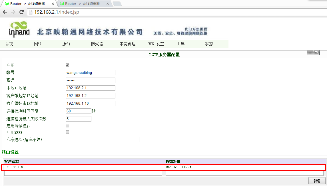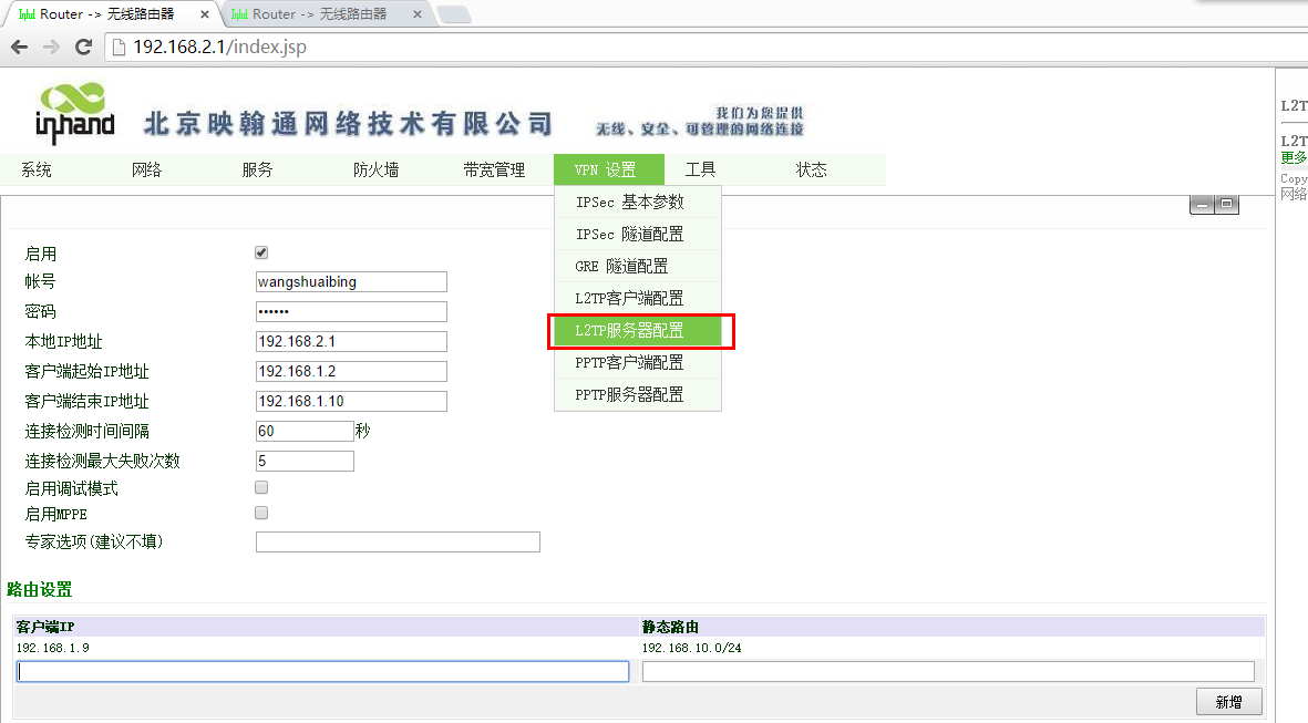 4、添加静态路由: 客户端IP 192.168.1.9 ,静态路由 192.168.10.0/24 , 客户端L2TP拨号IP地址为192.168.1.9,客户端路由器LAN地址为192.168.10.0/24 。