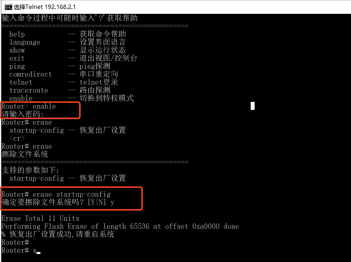 输入 enable 命令,进入特权模式 在命令行下输入 erase startup-config 提示“确认要擦除文件系统吗?” 输入 y 按回车键