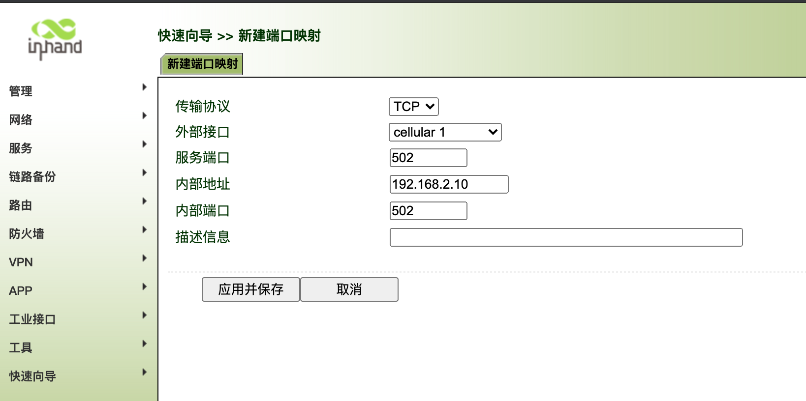 将内部192.168.2.10 TCP 502 端口映射到外网: