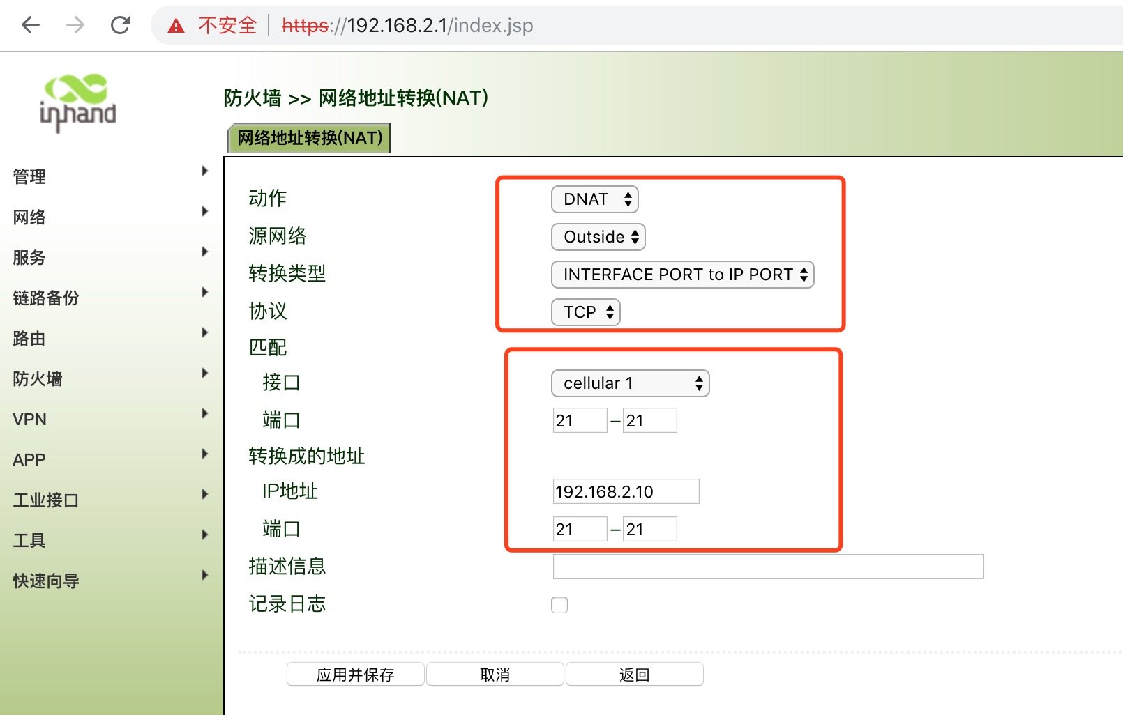 例如将内内网FTP服务器 192.168.2.10 的TCP 21端口映射到拨号端口的TCP 21 动作:DNAT 源网络:Outside 转换类型: interface port to IP port 协议:TCP 接口:celluar 1 端口:21-21 转换成的IP地址: 192.168.2.10 端口:21-21