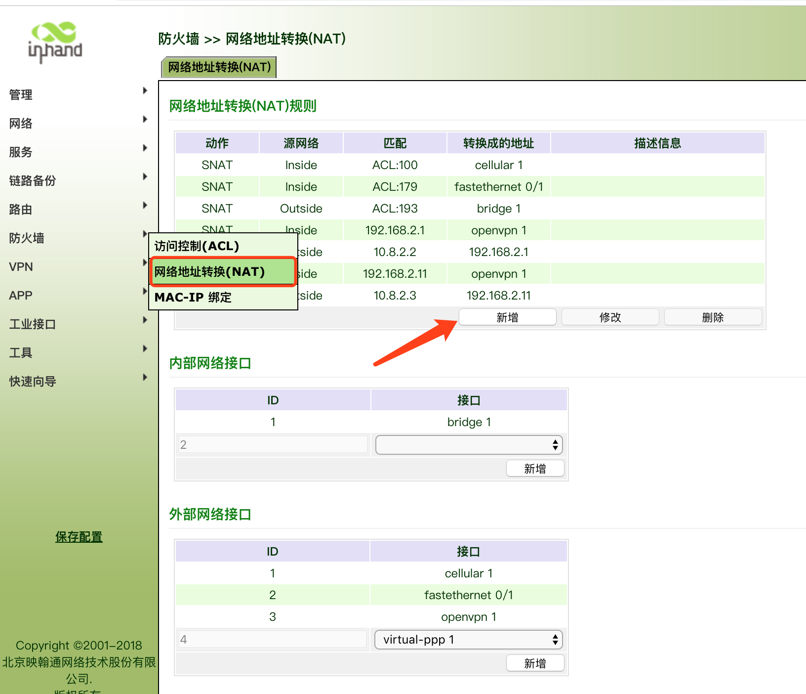 登录路由器进入 “防火墙-NAT”页面,点击“新增”