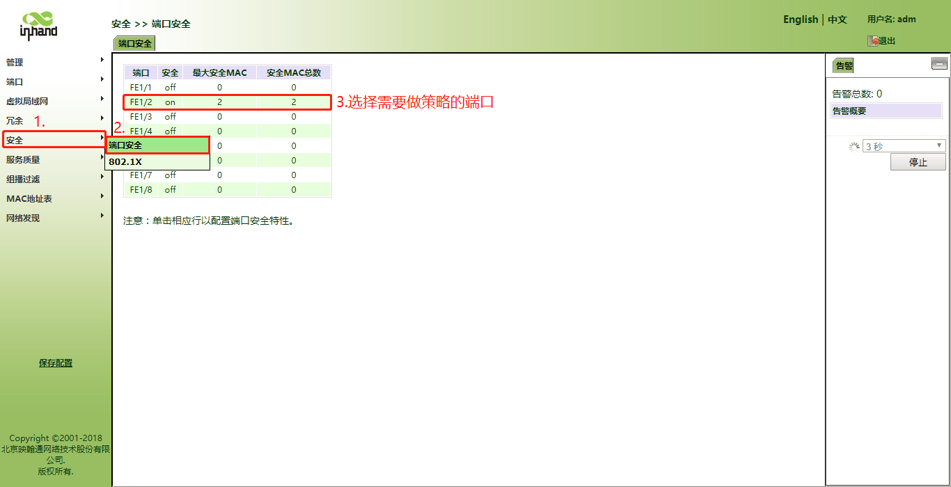 ISM网管型交换机,以ISM2008D为例; 进入web配置页面;安全=》端口安全=》选择策略接口
